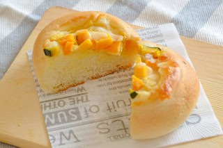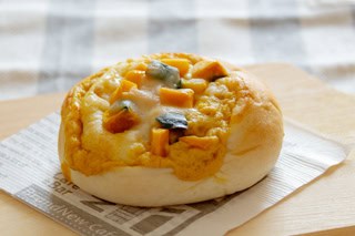 パンプキン入りの生地でグラタンフィリングを包み、角切りかぼちゃをのせて焼き上げました。