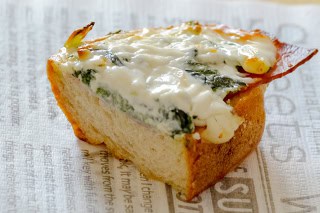 国産小麦を使用したカンパーニュをスライスし、ほうれん草パルメザンチーズソース、ベーコンをのせ焼き上げました。