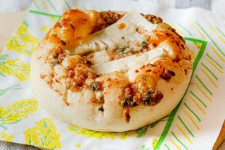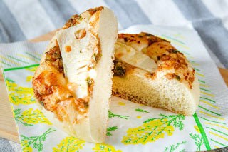 180円 ベーコンとコーンを入れたフィリングを包み、そら豆をのせて焼きました。